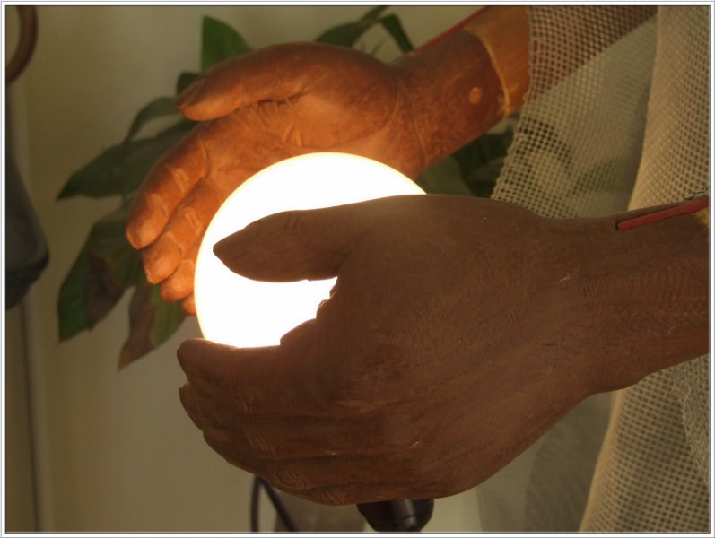 Le guérisseur Tête en hêtre ou ne pas être...... Structure en chêne et métal, mains en bois rouge exotique L'ampoule s'allume quand quelqu'un s'approche, il ressent l'énergie de l'autre et travaille avec. Il faut suivre le fil rouge du transport des énergies. inspiré par mon frère ostéopathe et un hommage à tous les guérisseurs.