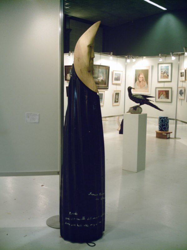 Mr. Lune Tête en hêtre, structure métallique, lumière intérieure, tôle ondulée percée pour faire les étoiles. Parce que dans mes carnets de notes, il y avait souvent: Noël est dans la lune, Noël passe son temps à rêver, il regarde voler les mouches. C'est donc un autoportrait, ne pas regarder la ressemblance physique, il n'y en as pas. Quelques phrases écrites sur la tôle: - Mr. Lune est encore dans la lune - Pensée : une idée nouvelle doit venir du vide entre les étoiles, dans une boite vide, on y met ce que l'on veut. et une devinette: je suis clair-obscur, qui suis-je ?